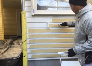 外壁中塗り(上塗り1回目)外壁の中塗り(上塗り1回目)を塗っているところです。下塗り同様毛足の短いローラーを使用して塗っていきます。つなぎ目が出ないようになるべく1列を素早く塗っていきます。 |