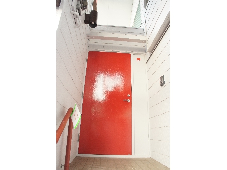 玄関ドアにもアクセントで鮮やかな赤色を配置してあります。